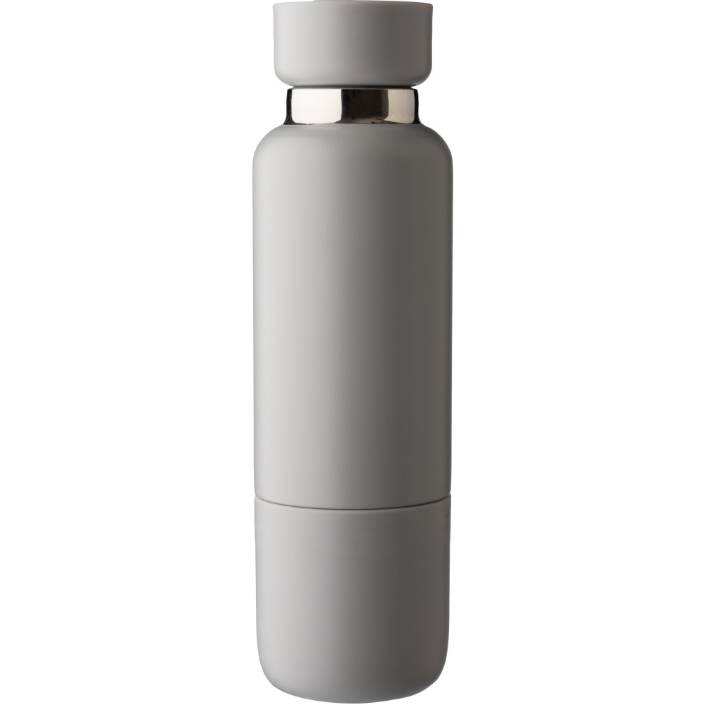 Rozsdamentes acél duplafalú, vákuumos palack PP pohárral az alján. Belseje 304 rozsdamentes acél, kívül 201 rozsdamentes acél. PP fedél AS átlátszó zárással, poliészter csuklópánttal és hordszíjjal. Matt színek. Barna kartondobozba egyedileg csomagolva érkezik. A palack űrtartalma: 500 ml, a pohár 300 ml. Emblémázás: Bögredekor, Gravírozás, Tamponnyomás