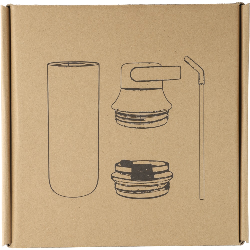 Duplafalú rozsdamentes acél kulacs (500 ml), belső anyaga 304-es rozsdamentes acél, külső része pedig 201-es rozsdamentes acél. Két tetővel szállítjuk: egy hordozófüles PP tetővel és egy átlátszó PS tetővel, amely a mellékelt rozsdamentes acél szívószállal, szilikon véggel és tartóval használható. Egyenként csomagolva, barna kartondobozban. Emblémázás: Bögredekor, Gravírozás, Körszita