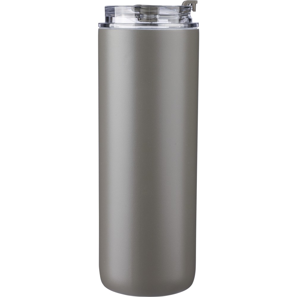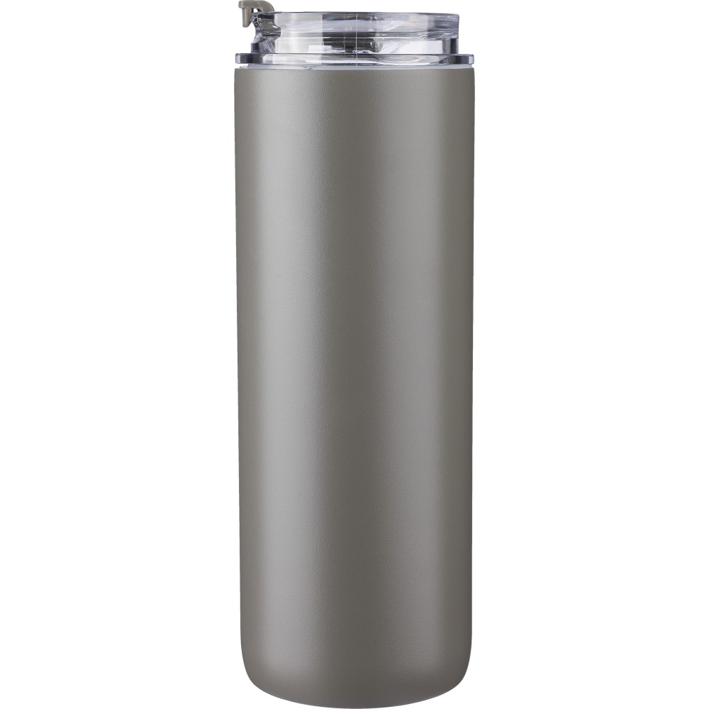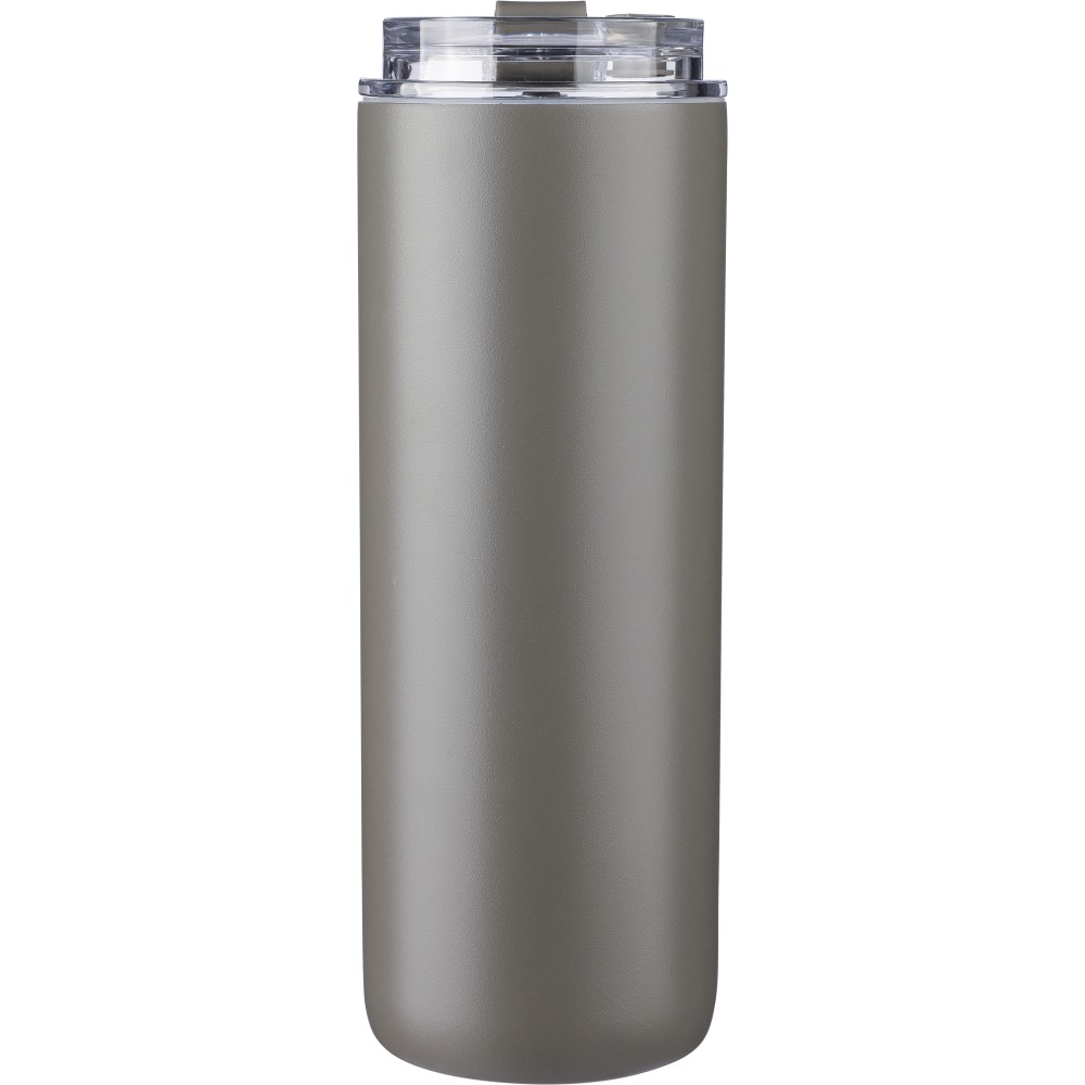 Duplafalú rozsdamentes acél kulacs (500 ml), belső anyaga 304-es rozsdamentes acél, külső része pedig 201-es rozsdamentes acél. Két tetővel szállítjuk: egy hordozófüles PP tetővel és egy átlátszó PS tetővel, amely a mellékelt rozsdamentes acél szívószállal, szilikon véggel és tartóval használható. Egyenként csomagolva, barna kartondobozban. Emblémázás: Bögredekor, Gravírozás, Körszita
