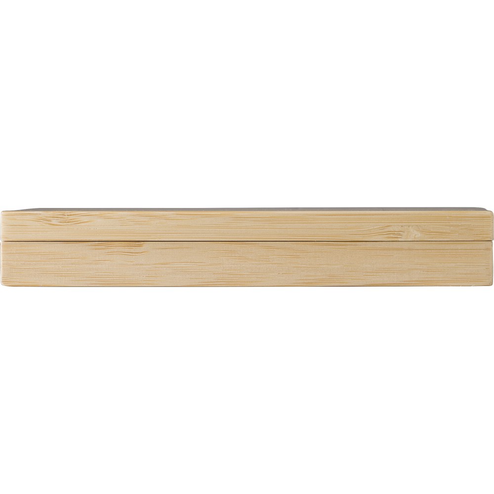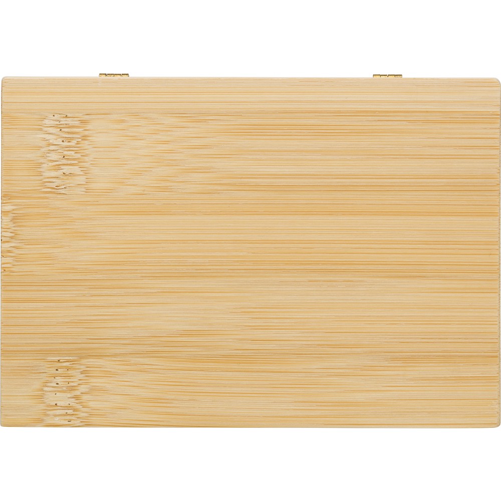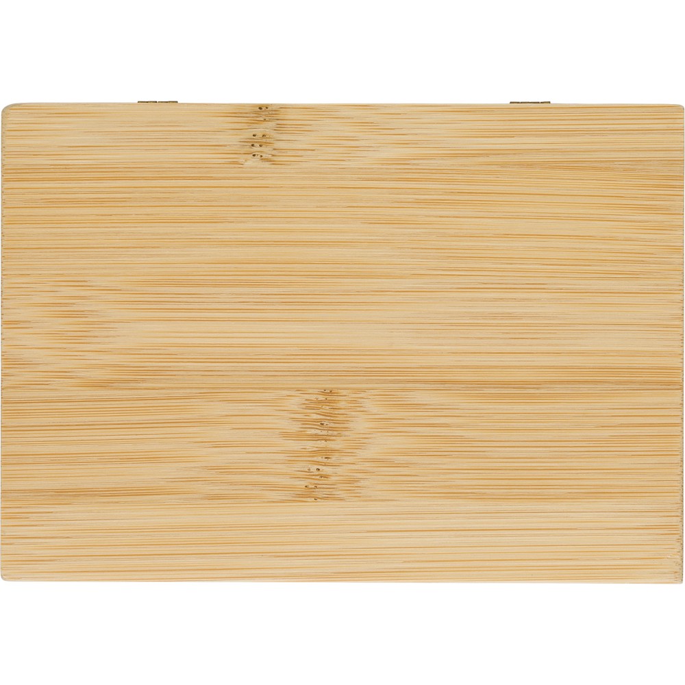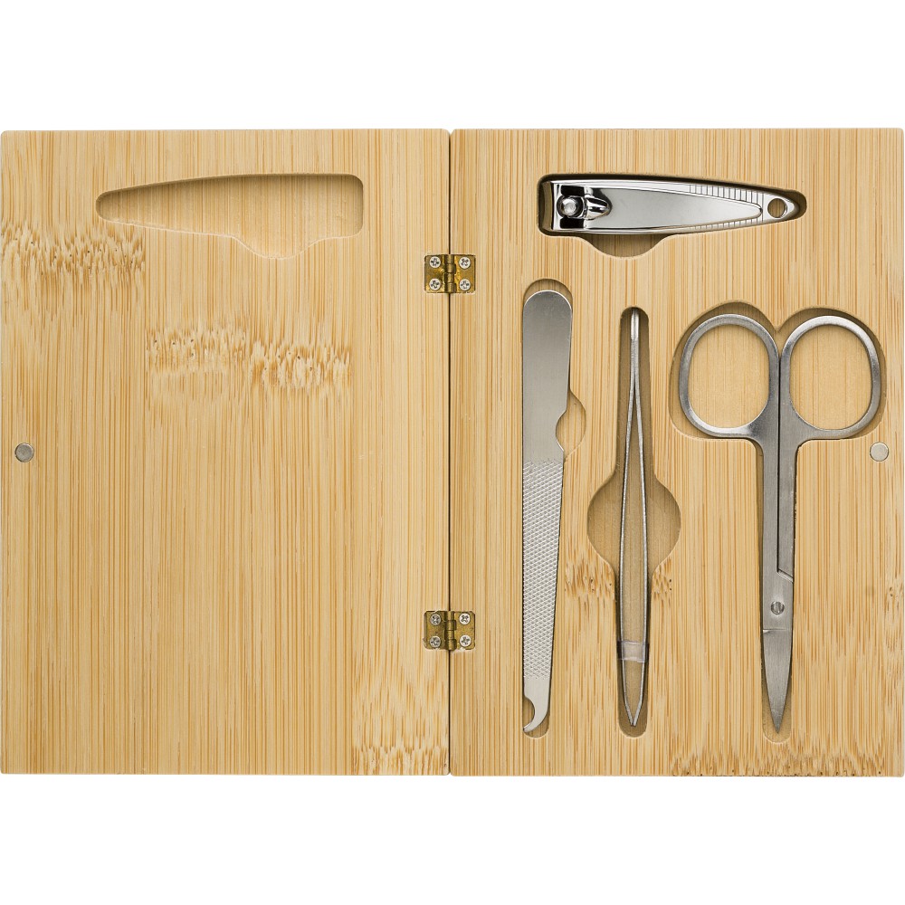 Manikűrkészet mágneses záródású bambusz tartóban. Négy darab eszközt tartalmaz. Csomagolása barna papírdoboz. Emblémázás: Gravírozás, Tamponnyomás