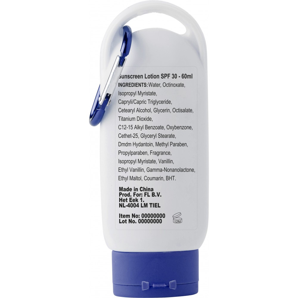 Naptej SPF 30 védelemmel, karabinerrel, színben illeszkedő tetővel. 60 ml. Emblémázás: Matricázás, Tamponnyomás
