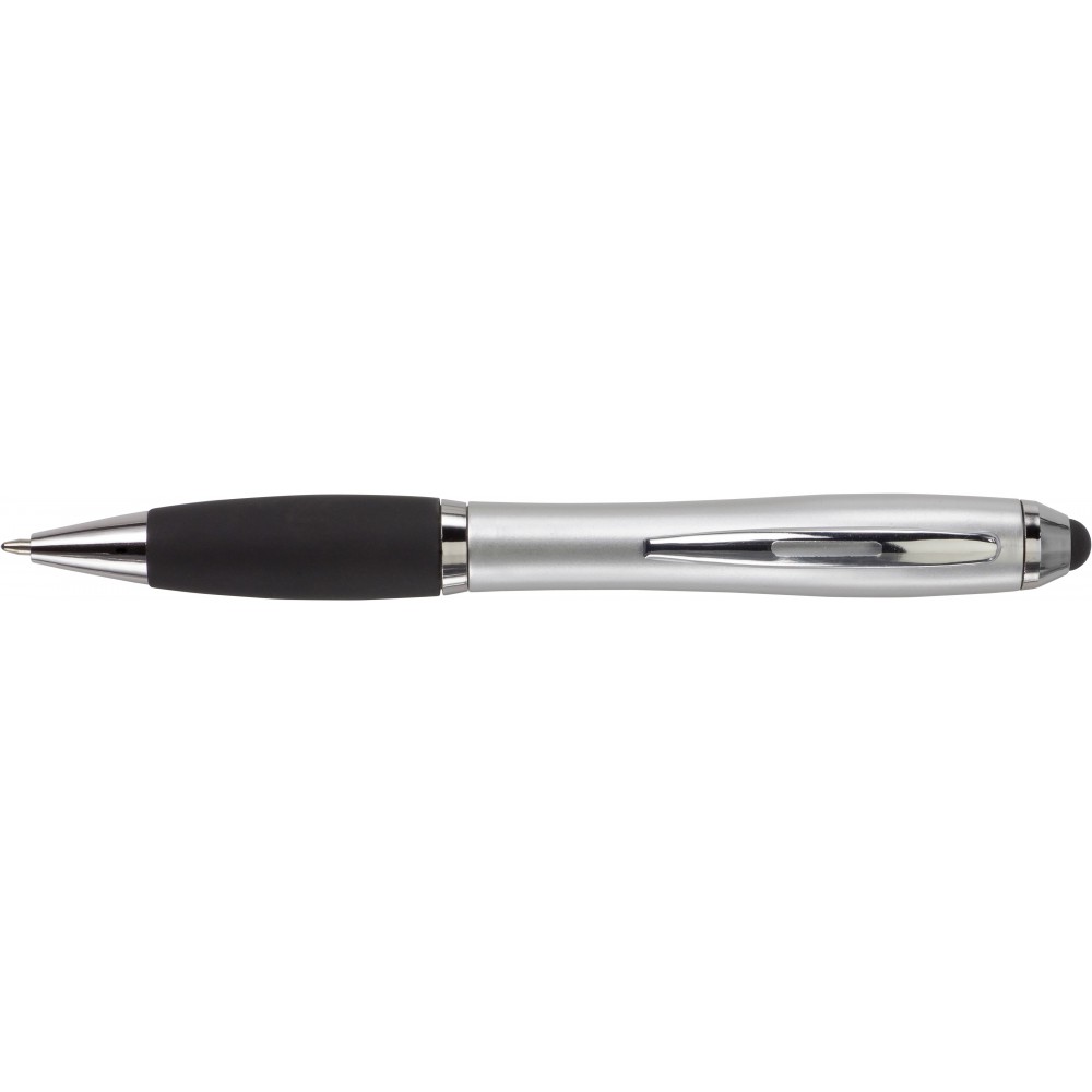 Érintős golyóstoll fekete tollbetéttel. A tetején lévő gumi segítségével érintőképernyős eszközökön használható. Emblémázás: Tamponnyomás, UV nyomtatás