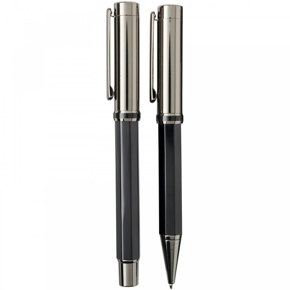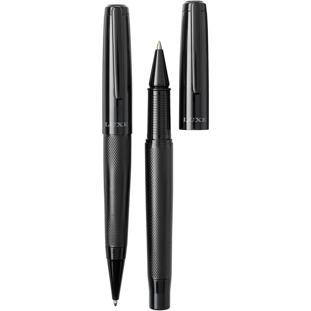Golyóstoll és rollerball készlet Luxe díszdobozban. Golyóstoll mérete: 14 cm x 1.45 cm, súlya: 40 gr, a tollbetét írási kapacitása: 800 m. Rollerball mérete: 13.8 cm x 1.45 cm, súlya: 54 gr. Rollerball írási kapacitása: 400 m. Fém. Emblémázás: Gravírozás