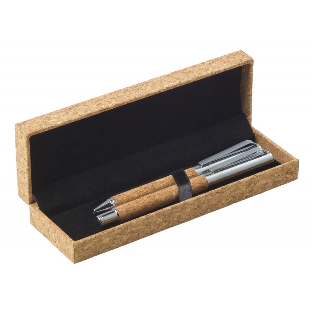 Tollkészlet golyóstollal és rollerball tollal. Parafa tolltestek króm kiegészítőkkel, kék tollbetéttel. Parafa tolldoboz bársony béléssel. Emblémázás: Gravírozás, Tamponnyomás, UV nyomtatás