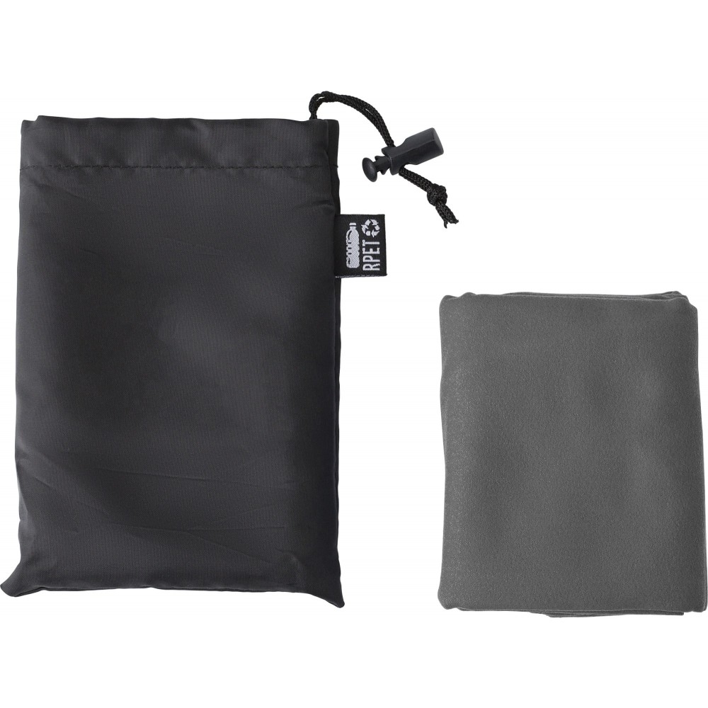 RPET törölköző tokkal. A törölköző mérete: 79 x 30 cm. Emblémázás: Hímzés, Szitanyomás