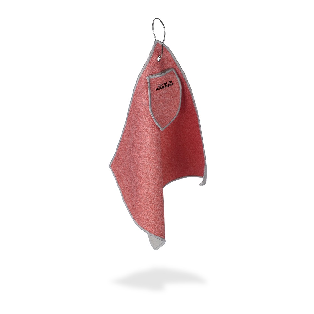 rPET golftörölköző tartozék labdatartó tokkal. A fém kampó segítségével könnyen a táskához csatlakoztatható. Belül rPET címkével. Mosógépben alacsony hőmérsékleten mosható. Emblémázás: Hímzés, Szitanyomás