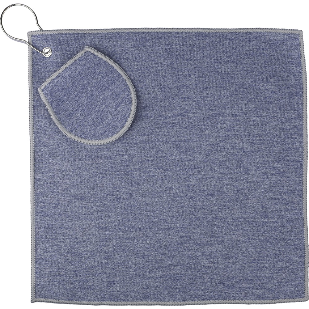 rPET golftörölköző tartozék labdatartó tokkal. A fém kampó segítségével könnyen a táskához csatlakoztatható. Belül rPET címkével. Mosógépben alacsony hőmérsékleten mosható. Emblémázás: Hímzés, Szitanyomás