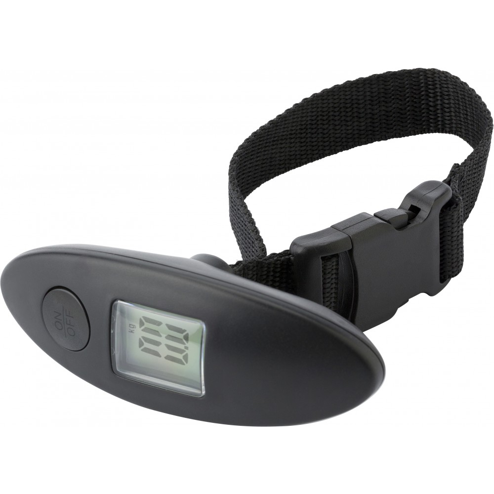 ABS digitális poggyászmérleg max. 40 kg-os csomag méréséhez, ki/bekapcsoló gombbal, csuklópánttal. Az elemet tartalmazza. Emblémázás: Tamponnyomás