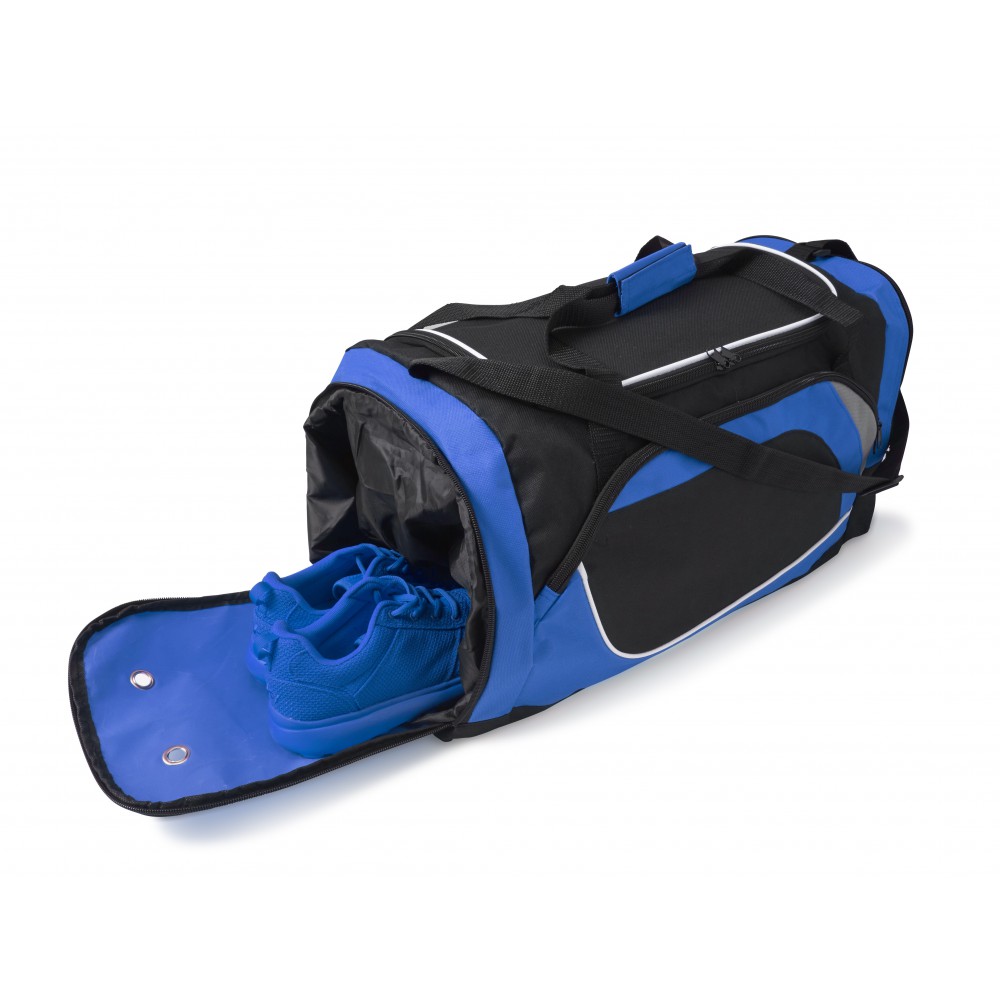 Sporttáska egy nagy főrésszel, egy oldalzsebbel és egy külön rész a cipő számára. 600D poliészter. Emblémázás: Szitanyomás