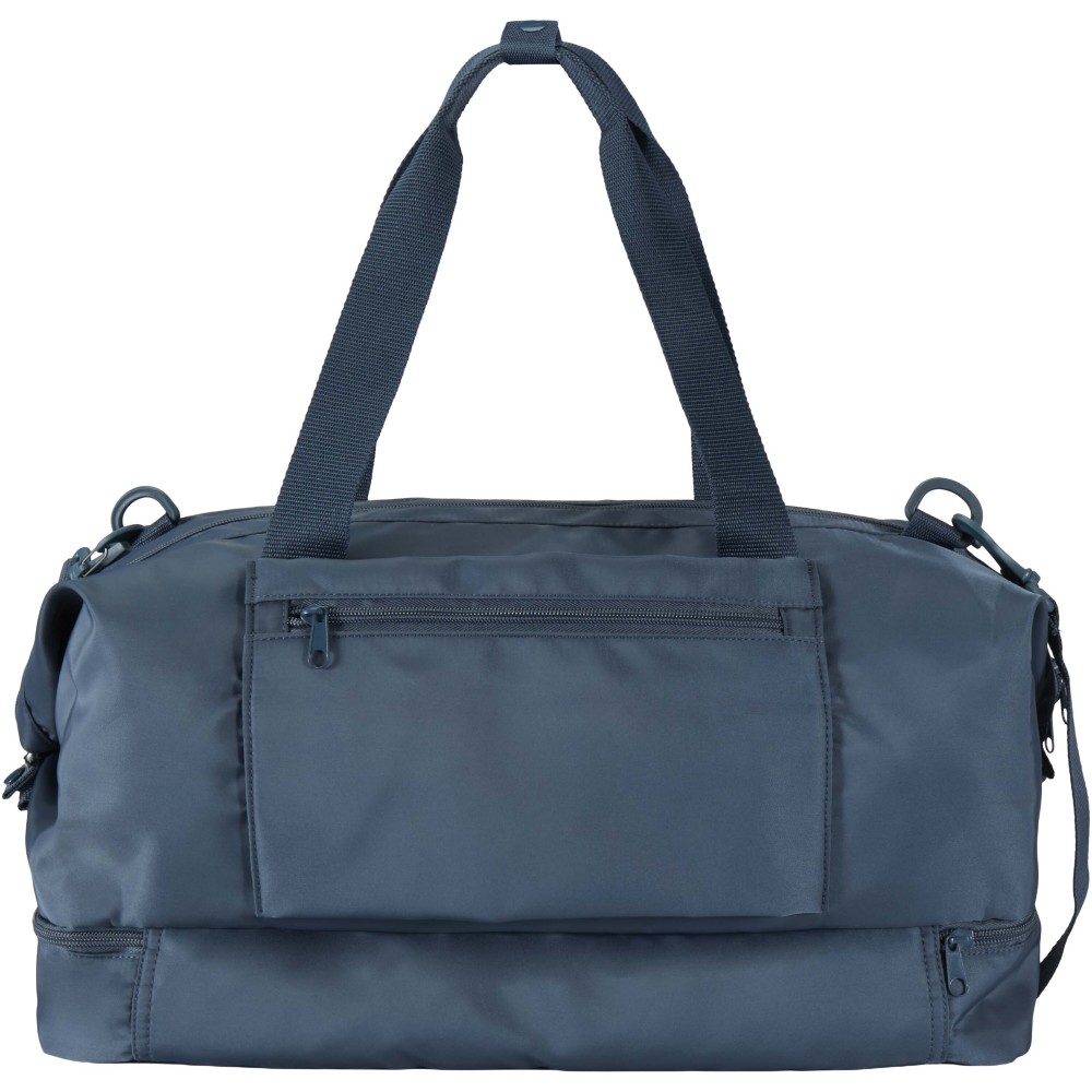 A Trip Aware® újrahasznosított utazó sporttáska sokoldalú és tágas társ, ideális rövid kiruccanásokhoz, valamint a szükséges holmik kényelmes szállításához. Tartós 290D twill poliészterből készült, puha kötött hátoldallal, RPET 210D/PU béléssel, így praktikus használatot és kényelmet biztosít. Fő rekesze nagy cipzáras zsebet tartalmaz, útlevél, tollak és kulcstartó szalag számára kialakított hellyel, valamint két belső nyitott zsebbel és dupla kulacstartóval. Külön alsó rekesze kagylószerűen nyílik, tökéletes cipők vagy egyéb felszerelések elkülönített tárolására. Minden táska Aware® nyomkövetővel érkezik, amely QR-kód segítségével lehetővé teszi a termék eredetének és útjának nyomon követését, növelve az ellátási lánc átláthatóságát és a kapcsolatot a termék gyártási folyamatával. Űrtartalom: 42 liter. Emblémázás: Szitanyomás