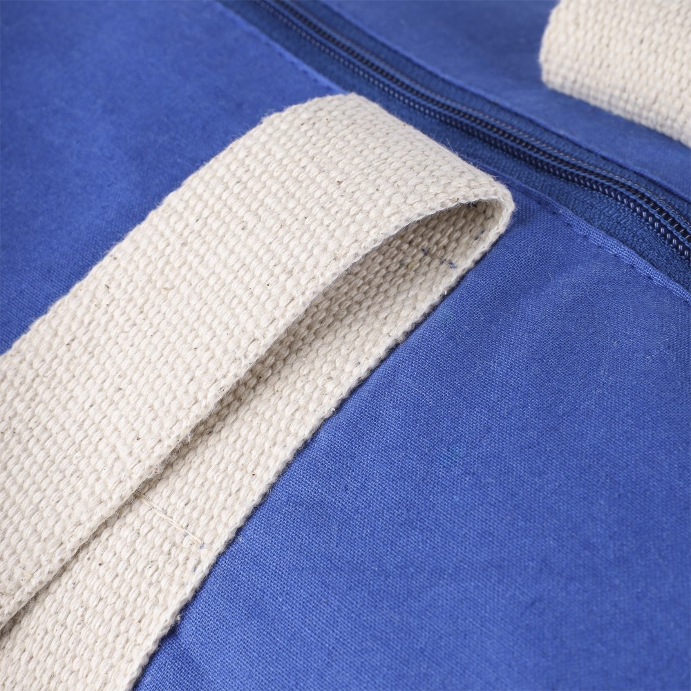 Oeko-Tex minősítésű, 180 g/m2 pamutból készült színes, cipzáras sporttáska 60 cm hosszúságú és 5 cm szélességű natúr pamutfülekkel. Oeko-Tex címkével ellátva.