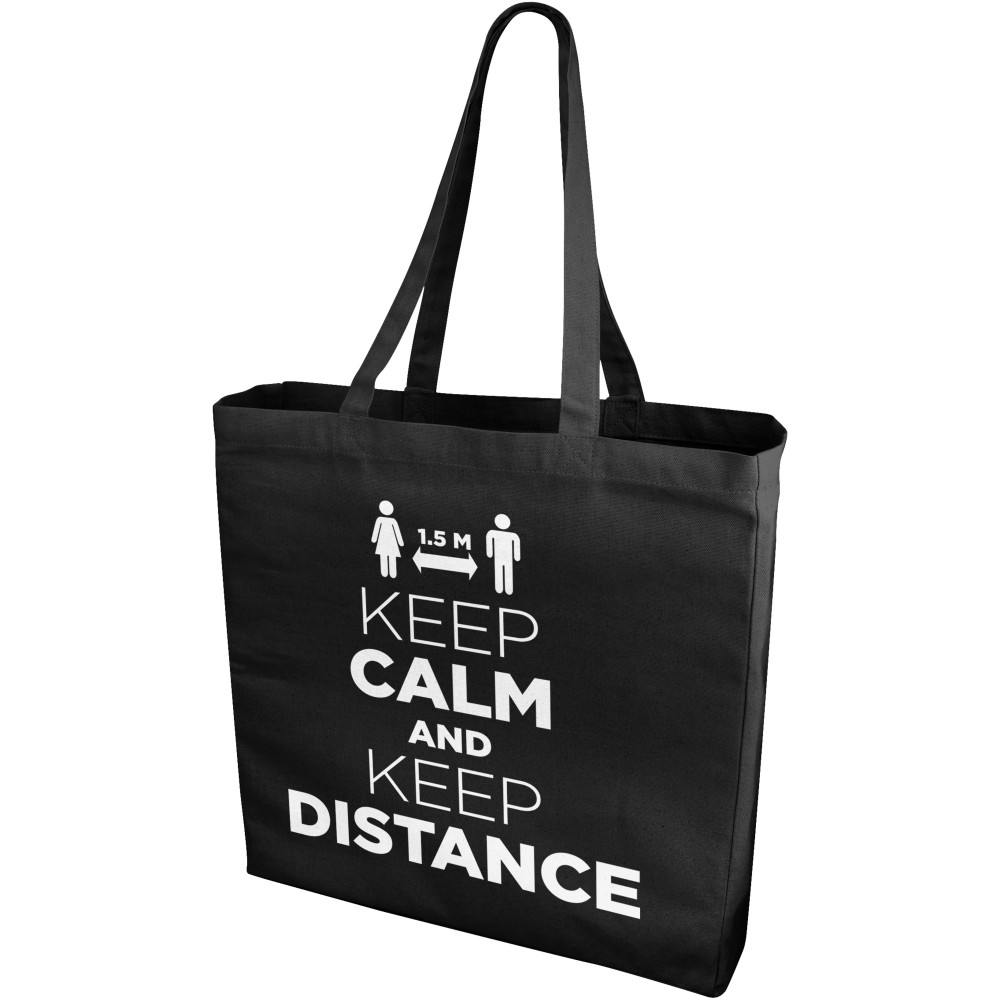 Nyitott tetejű táska háromszög alakú oldalbetéttel. A lehajtható fülek magassága 31 cm. 220 g/m2 pamut. Emblémázás: Szitanyomás