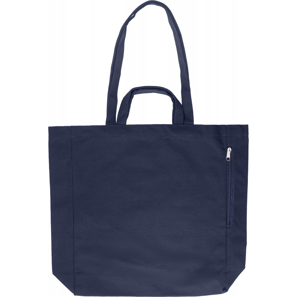 Újrahasznosított pamut bevásárlótáska rövid és hosszú füllel. Oldalt cipzáras zseb. 350g/m2 Emblémázás: Szitanyomás