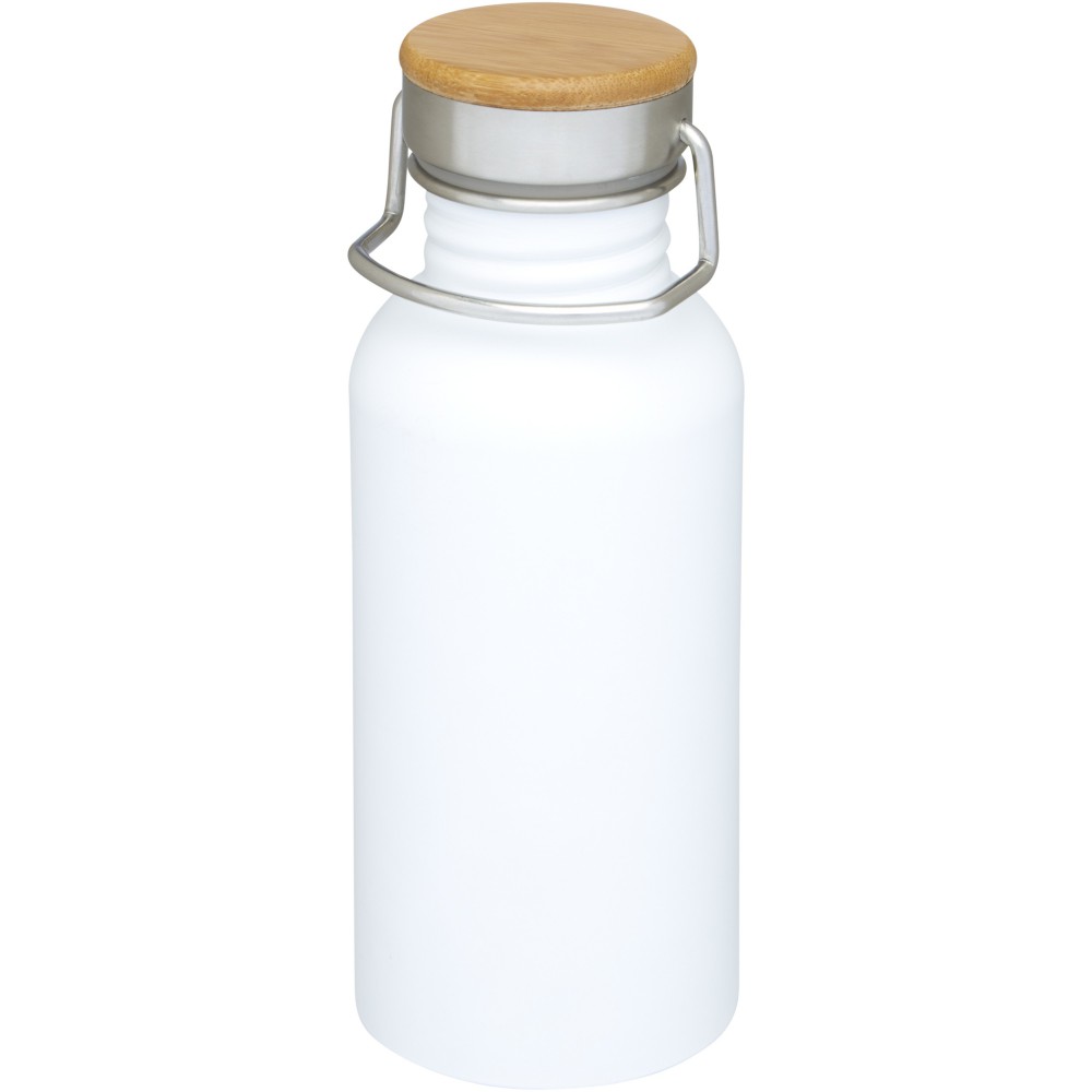 Egyfalú rozsdamentes acél palack csavaros tetővel. A fedélen bambusz rátét, valamint egy fül a könnyű hordozhatóságért. Szivárgásmentes. Szénsavas italokkal nem használható. Mosogatógépben nem mosható és mikrohullámú sütőben történő melegítésre nem alkalmas. Űrtartalom: 550 ml. Csomagolása Avenue díszdoboz. Rozsdamentes acél, bambusz. Emblémázás: Bögredekor, Gravírozás, Körszita, Tamponnyomás
