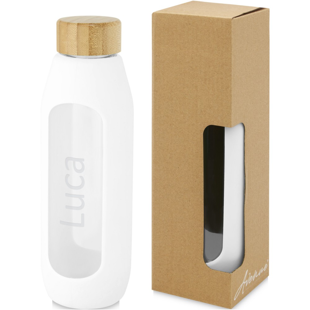 Környezetbarát újrafelhasználható vizes palack. A palack tartós boroszilikát üvegből készült, amely megőrzi a víz tiszta, igazi friss ízét, és nem tartalmaz káros vegyszereket. Szilikon markolattal és biobambuszból készült szivárgásmentes fedéllel. A német élelmiszerbiztonsági jogszabályok (LFGB) szerint tesztelték és jóváhagyták, és a REACH előírásai szerint tesztelték a ftaláttartalmat. Szivárgásmentes. Szénsavas italokkal nem használható. Mosogatógépben nem mosható és mikrohullámú sütőben történő melegítésre nem alkalmas. Űrtartalom: 600 ml. Újrahasznosított karton díszdobozban. Emblémázás: Gravírozás, Tamponnyomás