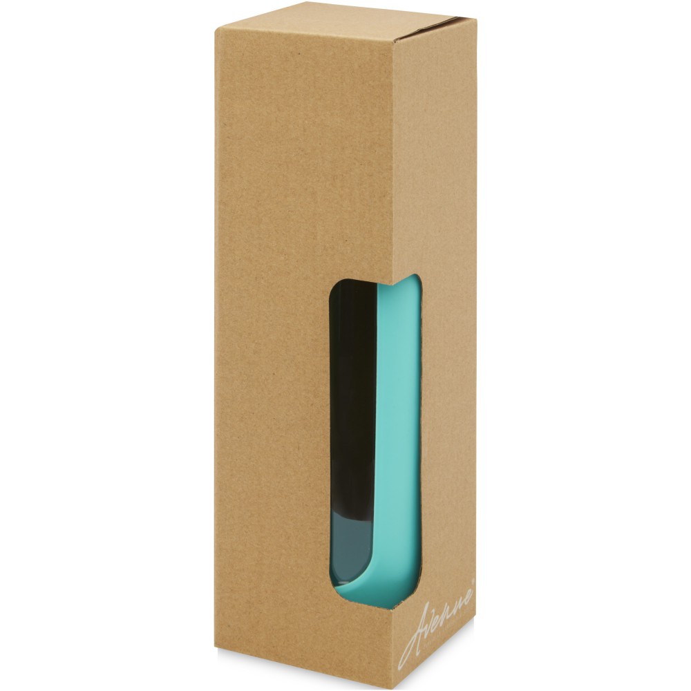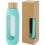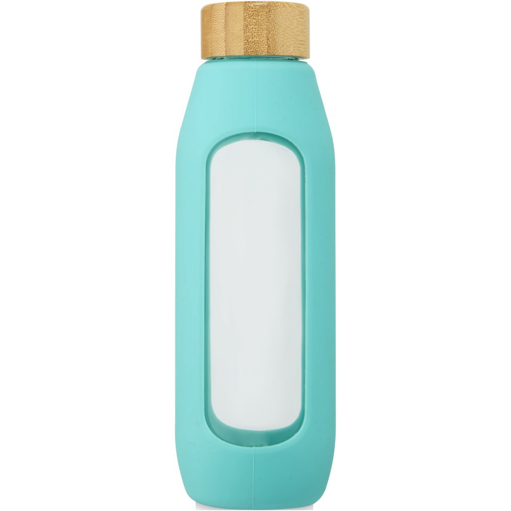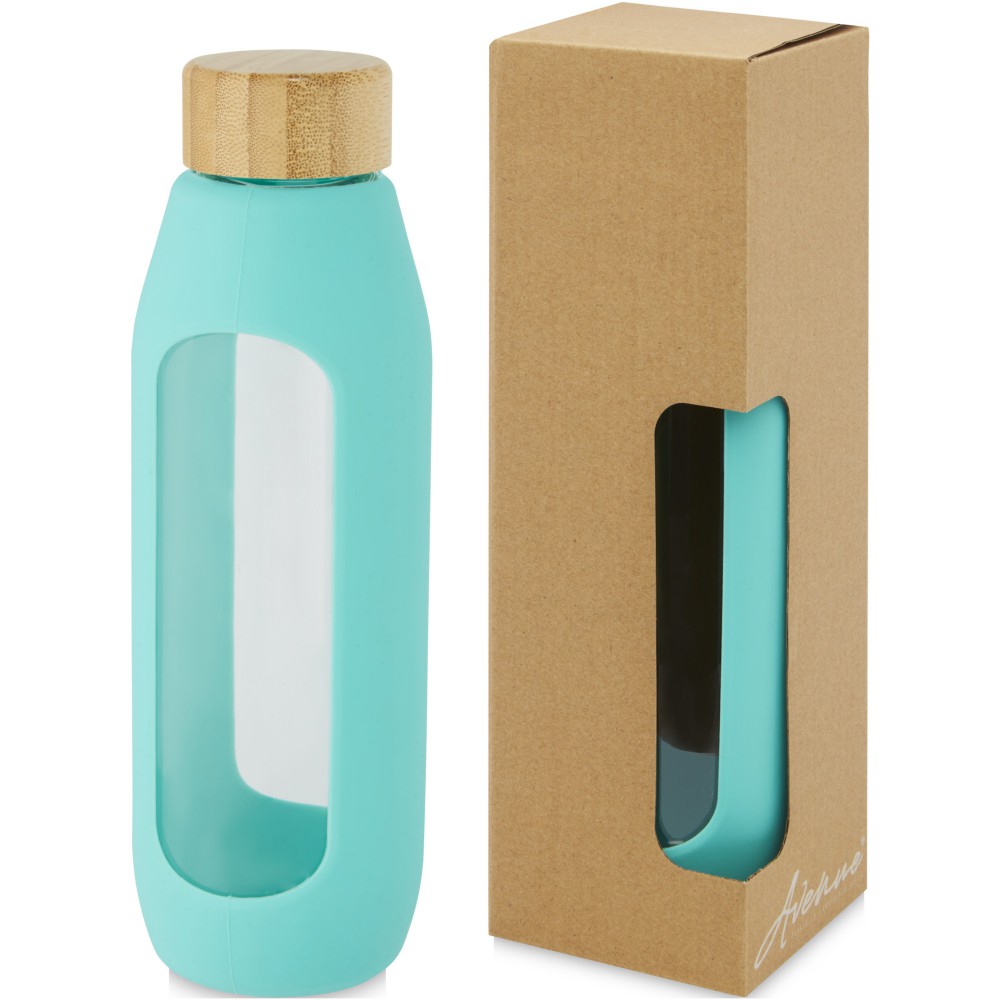 Környezetbarát újrafelhasználható vizes palack. A palack tartós boroszilikát üvegből készült, amely megőrzi a víz tiszta, igazi friss ízét, és nem tartalmaz káros vegyszereket. Szilikon markolattal és biobambuszból készült szivárgásmentes fedéllel. A német élelmiszerbiztonsági jogszabályok (LFGB) szerint tesztelték és jóváhagyták, és a REACH előírásai szerint tesztelték a ftaláttartalmat. Szivárgásmentes. Szénsavas italokkal nem használható. Mosogatógépben nem mosható és mikrohullámú sütőben történő melegítésre nem alkalmas. Űrtartalom: 600 ml. Újrahasznosított karton díszdobozban. Emblémázás: Gravírozás, Tamponnyomás