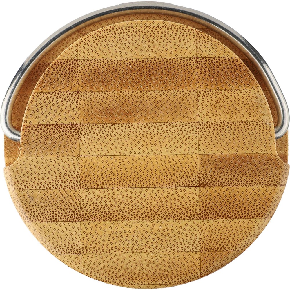Palack bambusz fedéllel és fém hordozófüllel. Egyenként barna kartondobozba csomagolva. Anyaga: üveg. Űrtartalom: 500 ml. Emblémázás: Bögredekor, Gravírozás