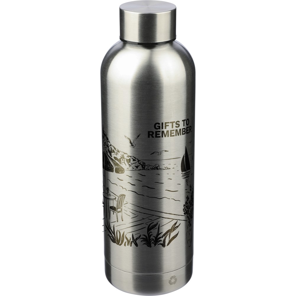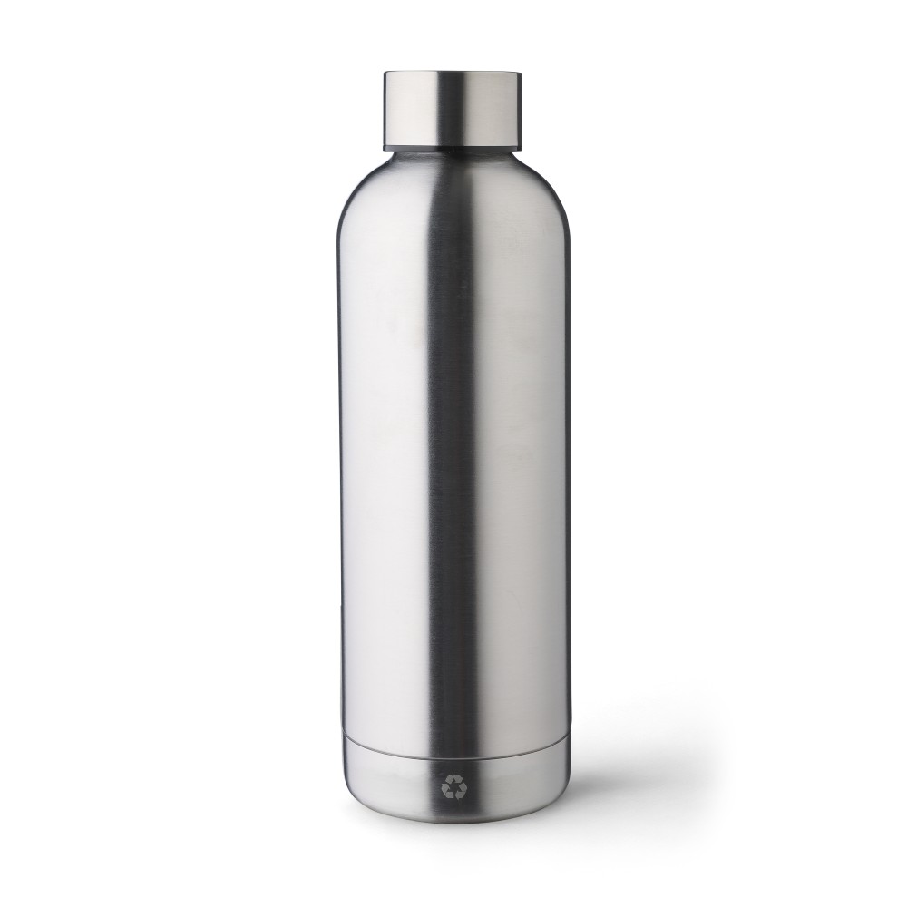 Újrahasznosított rozsdamentes acél (s/s304) duplafalú palack, matt felülettel. Barna kartondobozba egyedileg csomagolva. Űrtartalom: 500 ml. Emblémázás: Bögredekor, Gravírozás, Körszita, Tamponnyomás