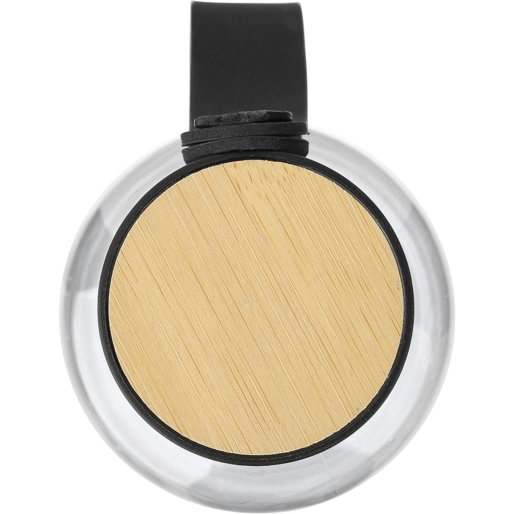 Szimplafalú rPET palack, 750 ml. PP kupakkal, melynek felső része bambuszból készült, és szilikon hordozópánttal. Mosogatógépben nem tisztítható. Emblémázás: Gravírozás, Tamponnyomás