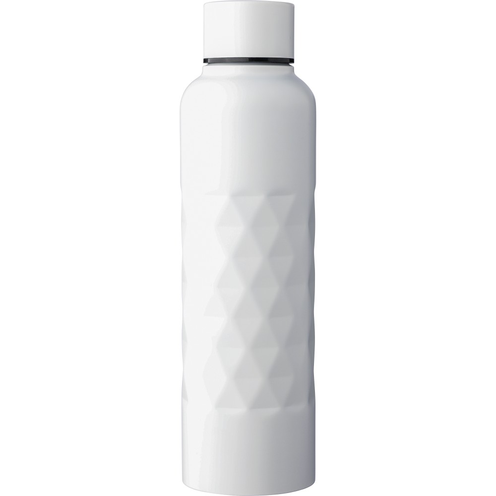 Újrahasznosított 304-es rozsdamentes acélból készült szimplafalú kulacs, 800 ml-es. Gyémánt alakú textúrával a testen, csavaros tetővel és lézergravírozott újrahasznosított logóval. Egyenként csomagolva, barna kartondobozban. Emblémázás: Bögredekor, Gravírozás, Körszita