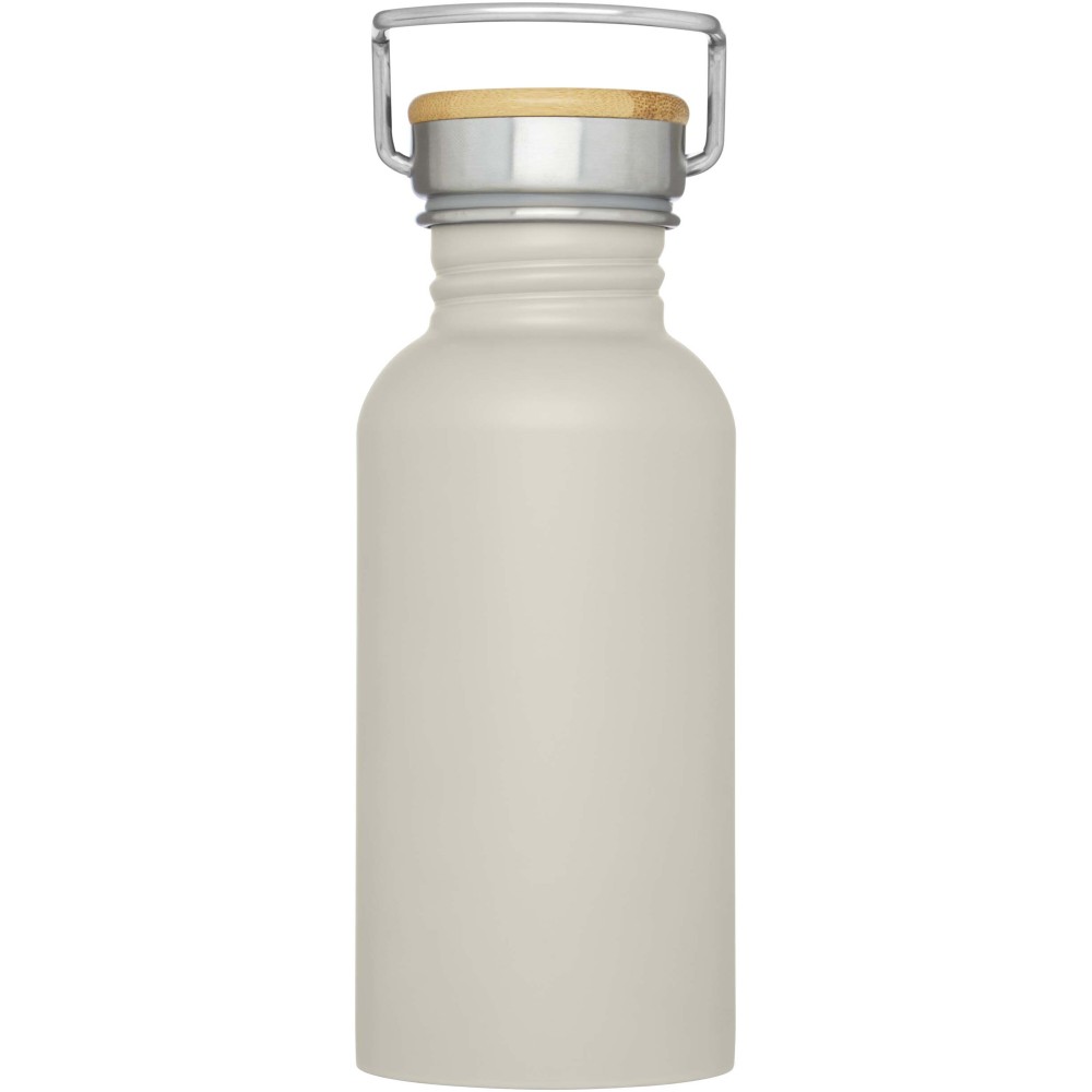 Egyfalú rozsdamentes acél palack csavaros tetővel. A fedélen bambusz rátét, valamint egy fül a könnyű hordozhatóságért. Szivárgásmentes. Szénsavas italokkal nem használható. Mosogatógépben nem mosható és mikrohullámú sütőben történő melegítésre nem alkalmas. Űrtartalom: 550 ml. Csomagolása Avenue díszdoboz. Rozsdamentes acél, bambusz. Emblémázás: Bögredekor, Gravírozás, Körszita, Tamponnyomás